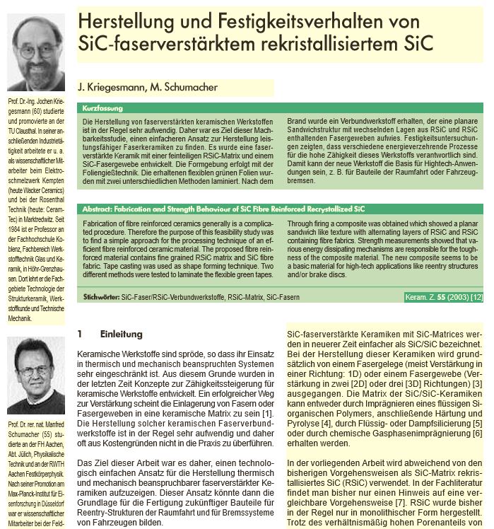 Brand wurde ein Verbundwerkstoff erhalten, der eine planare Sandwichstruktur mit wechselnden Lagen aus RSiC und RSiC enthaltenden Fasergeweben aufwies. Festigkeitsuntersuchungen zeigten, dass verschiedene energieverzehrende Prozesse für die hohe Zähigkeit dieses Werkstoffs verantwortlich sind. Damit kann der neue Werkstoff die Basis für Hightech-Anwendungen sein, z. B. für Bauteile der Raumfahrt oder Fahrzeugbremsen.